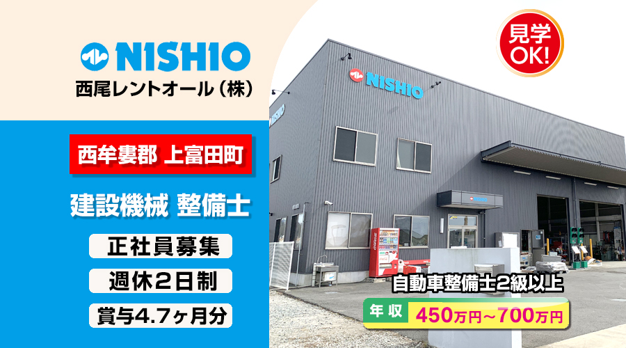 自動車整備士2級以上求人!年収450万円以上!和歌山県西牟婁郡上富田町 西尾レントオール株式会社 転職採用情報!キャリアアップ転職をサポート致します。