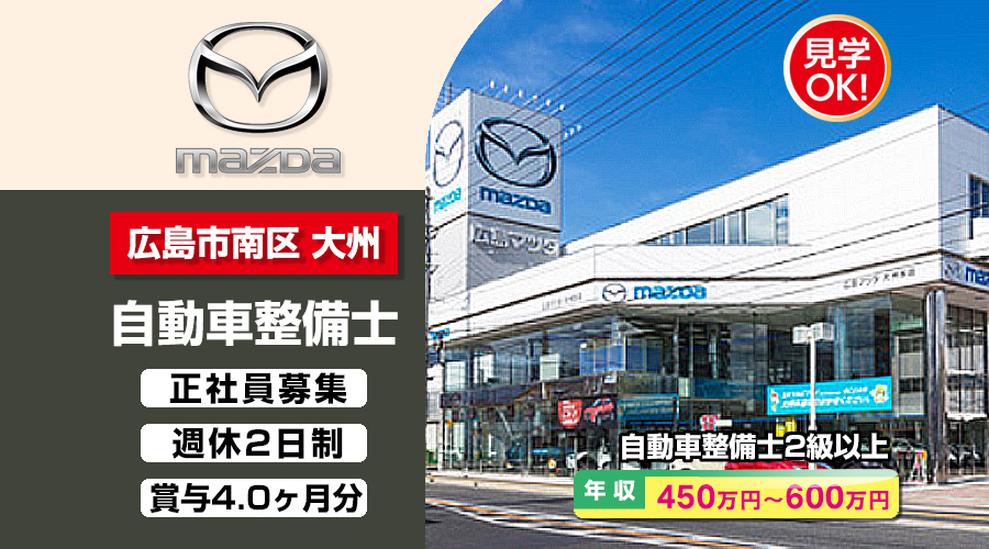 自動車整備士2級以上求人!年収450万円以上!広島県広島市南区大州 株式会社 広島マツダ 転職採用情報!働きながらでも転職サポート致します。
