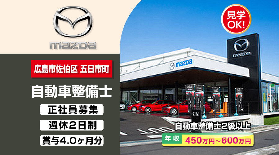 自動車整備士2級以上求人!年収450万円以上!広島県広島市佐伯区五日市町 株式会社 広島マツダ 転職採用情報!働きながらでも転職サポート致します。