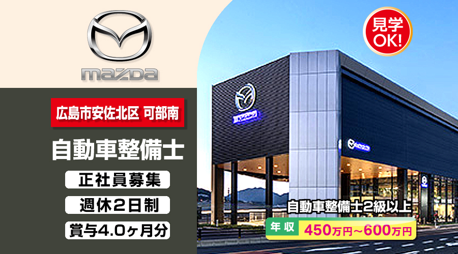 自動車整備士2級以上求人!年収450万円以上!広島県広島市安佐北区 株式会社 広島マツダ 転職採用情報!働きながらでも転職サポート致します。