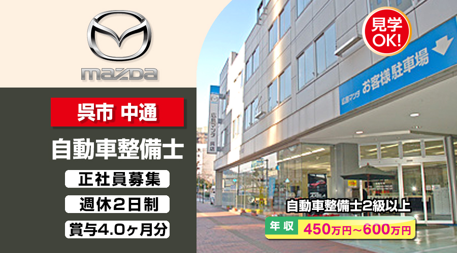 自動車整備士2級以上求人!年収450万円以上!広島県呉市中通 株式会社 広島マツダ 転職採用情報!働きながらでも転職サポート致します。