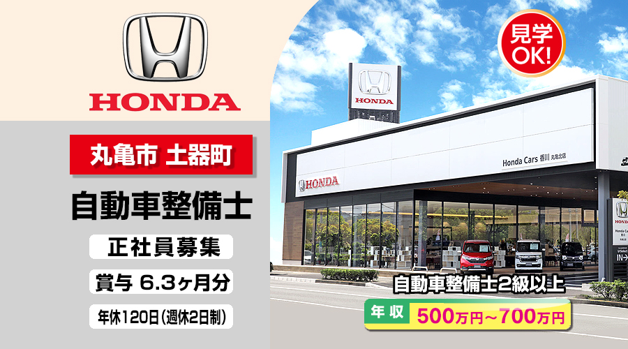 自動車整備士2級以上求人!年収500万円以上!香川県丸亀市土器町東 株式会社ホンダモビリティ中四国 転職採用情報!働きながらでも転職サポート致します。
