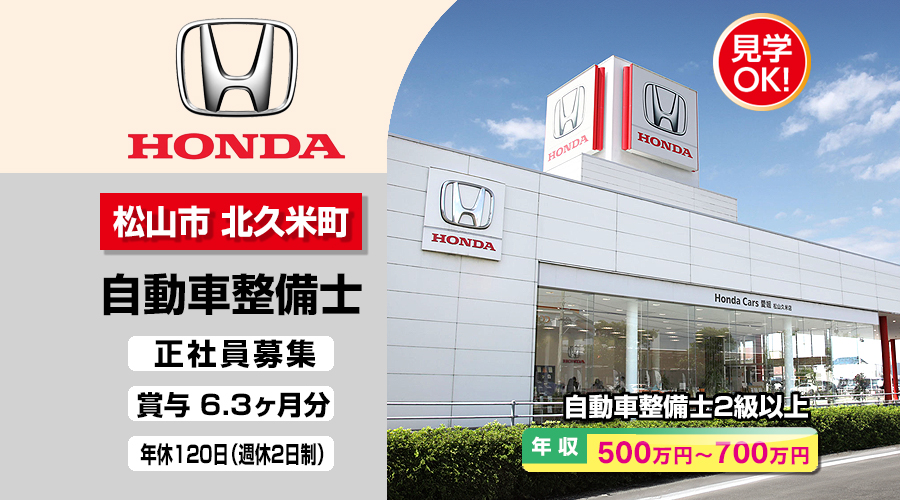 自動車整備士2級以上求人!年収500万円以上!愛媛県松山市北久米町 株式会社ホンダモビリティ中四国 転職採用情報!働きながらでも転職サポート致します。