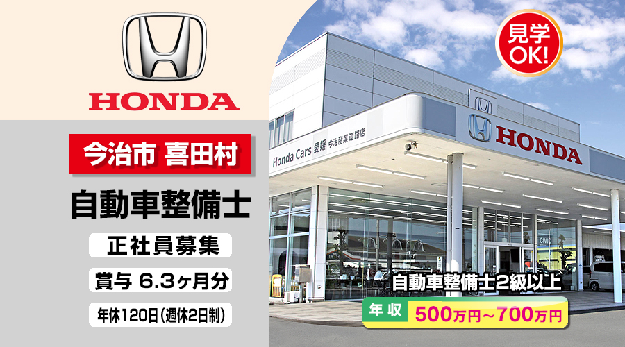 自動車整備士2級以上求人!年収500万円以上!愛媛県今治市喜田村 株式会社ホンダモビリティ中四国 転職採用情報!働きながらでも転職サポート致します。