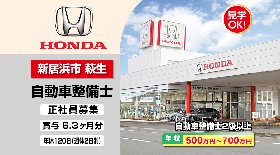 自動車整備士2級以上求人!年収500万円以上!愛媛県新居浜市萩生 株式会社ホンダモビリティ中四国 転職採用情報!働きながらでも転職サポート致します。