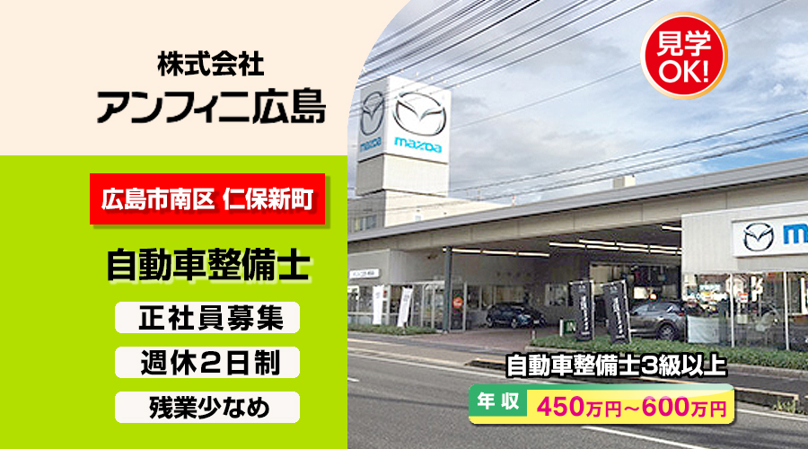 自動車整備士3級以上求人!年収450万円以上!広島県広島市南区仁保新町 株式会社アンフィニ広島 MAZDA(マツダ)販売店転職採用情報!働きながらでも転職サポート致します。