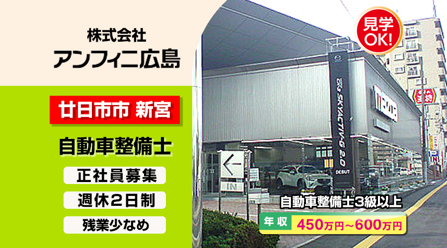 自動車整備士3級以上求人!年収450万円以上!広島県廿日市市新宮 株式会社アンフィニ広島 MAZDA(マツダ)販売店転職採用情報!働きながらでも転職サポート致します。