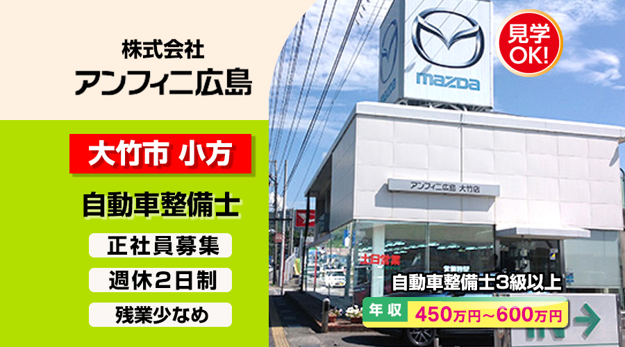 自動車整備士3級以上求人!年収450万円以上!広島県大竹市小方 株式会社アンフィニ広島 MAZDA(マツダ)販売店転職採用情報!働きながらでも転職サポート致します。