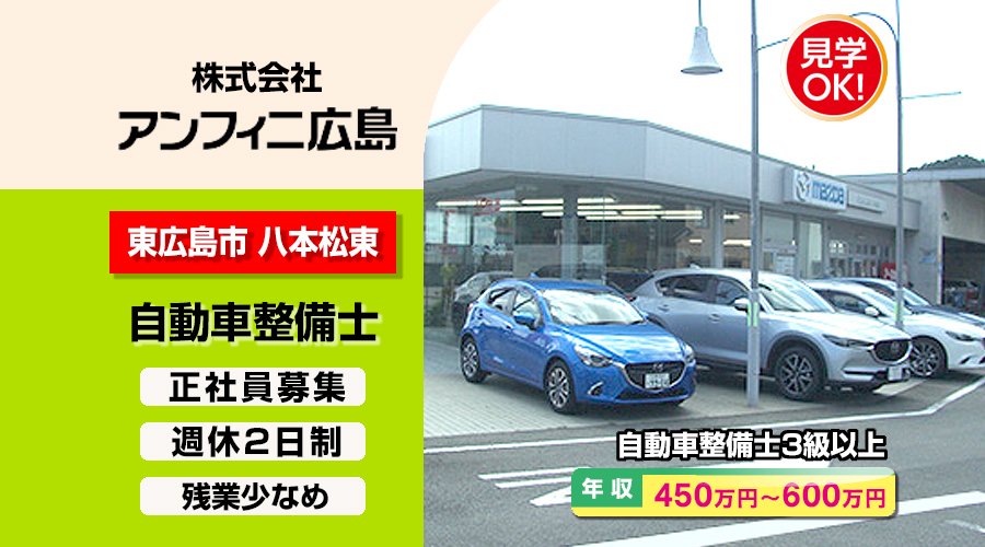 自動車整備士3級以上求人!年収450万円以上!広島県東広島市八本松東 株式会社アンフィニ広島 MAZDA(マツダ)販売店転職採用情報!働きながらでも転職サポート致します。