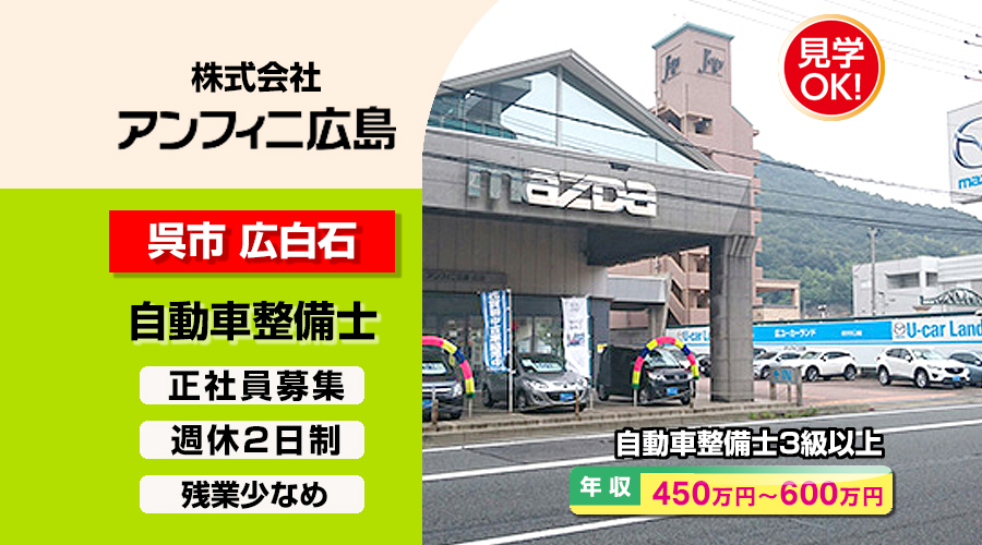 自動車整備士3級以上求人!年収450万円以上!広島県呉市広白石 株式会社アンフィニ広島 MAZDA(マツダ)販売店転職採用情報!働きながらでも転職サポート致します。