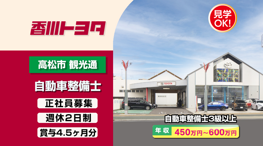 自動車整備士3級以上求人!年収450万円以上!香川県高松市観光通 香川トヨタ自動車株式会社転職採用情報!働きながらでも転職サポート致します。