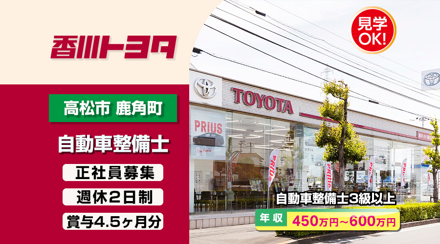 自動車整備士3級以上求人!年収450万円以上!香川県高松市 香川トヨタ自動車株式会社転職採用情報!働きながらでも転職サポート致します。