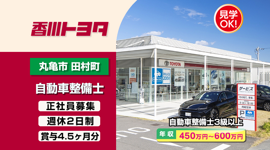 自動車整備士3級以上求人!年収450万円以上!香川県丸亀市田村町 香川トヨタ自動車株式会社転職採用情報!働きながらでも転職サポート致します。