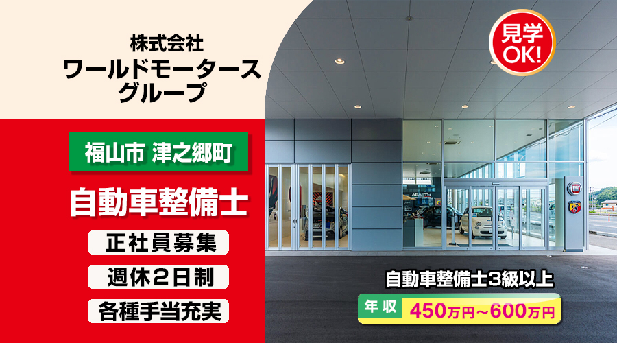 自動車整備士3級以上求人!年収450万円以上!広島県福山市 株式会社ワールドモータースグループ転職採用情報!働きながらでも転職サポート致します。