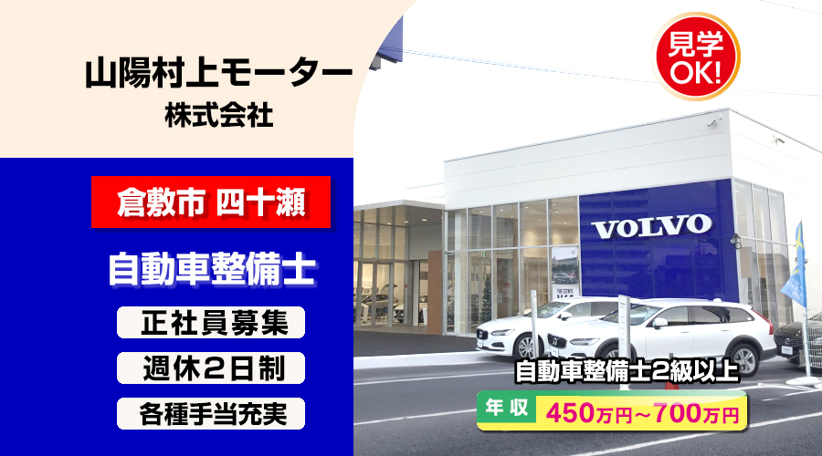 自動車整備士2級以上求人!年収450万以上!岡山県倉敷市 山陽村上モーター株式会社転職採用情報!働きながらでも転職サポート致します。