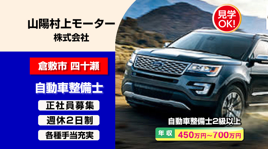 自動車整備士2級以上求人!年収450万以上!岡山県倉敷市 山陽村上モーター株式会社転職採用情報!働きながらでも転職サポート致します。
