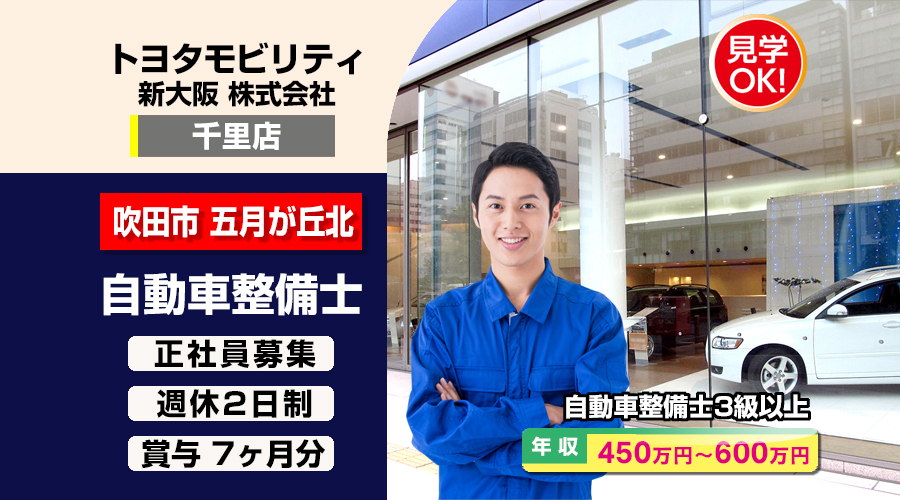 トヨタモビリティ新大阪株式会社 (千里店)【トヨタモビリティ新大阪】 自動車整備士・メカニック(吹田市五月が丘北)
