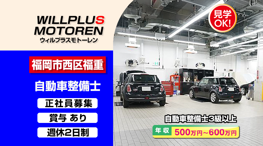 ウイルプラスモトーレン株式会社【ウイルプラスモトーレン】 自動車整備士・メカニック(福岡市西区福重)