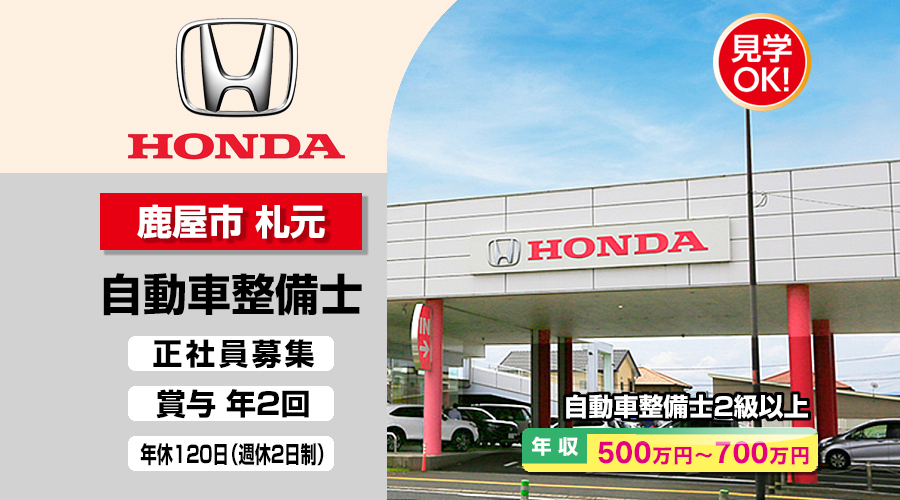 自動車整備士2級以上求人!年収500万円以上!鹿児島県鹿屋市札元 株式会社ホンダモビリティ九州 転職採用情報!給料・環境・社会保険充実!