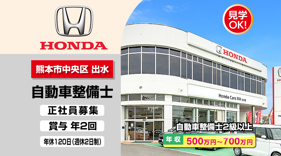 自動車整備士2級以上求人!年収500万円以上!熊本県熊本市中央区出水 株式会社ホンダモビリティ九州 転職採用情報!給料・環境・社会保険充実!