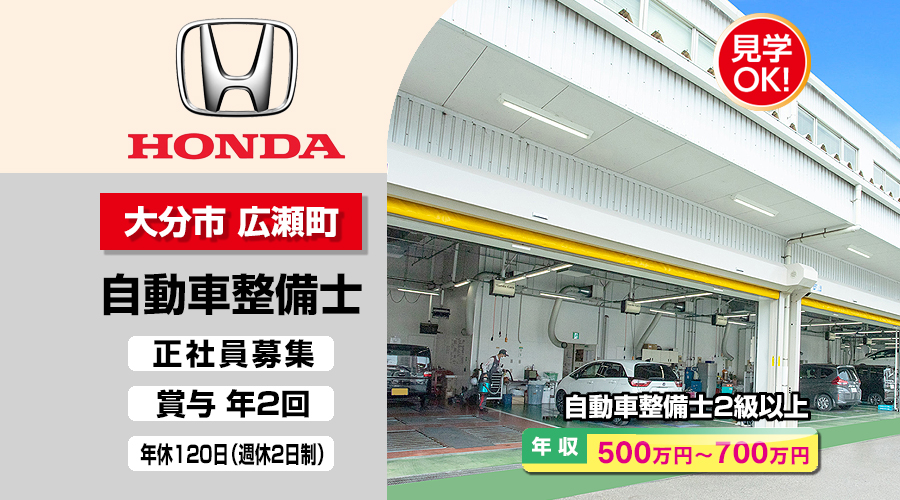 自動車整備士2級以上求人!年収500万円以上!大分県大分市広瀬町 株式会社ホンダモビリティ九州 転職採用情報!給料・環境・社会保険充実!
