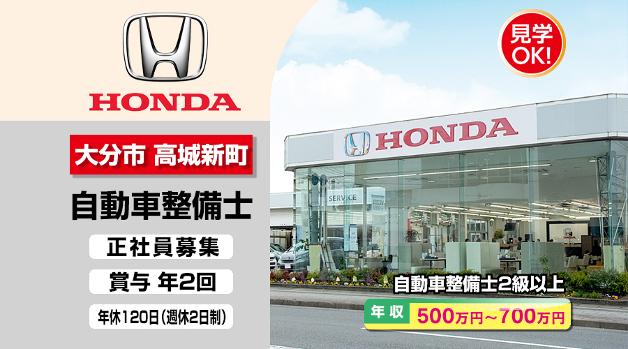 自動車整備士2級以上求人!年収500万円以上!大分県大分市高城新町 株式会社ホンダモビリティ九州 転職採用情報!給料・環境・社会保険充実!
