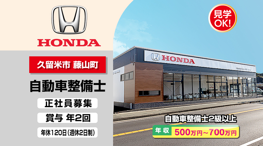 自動車整備士2級以上求人!年収500万円以上!福岡県久留米市藤山町 株式会社ホンダモビリティ九州 転職採用情報!給料・環境・社会保険充実!
