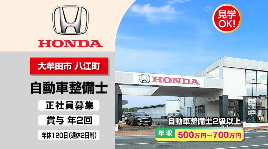 自動車整備士2級以上求人!年収500万円以上!福岡県大牟田市八江町 株式会社ホンダモビリティ九州 転職採用情報!給料・環境・社会保険充実!