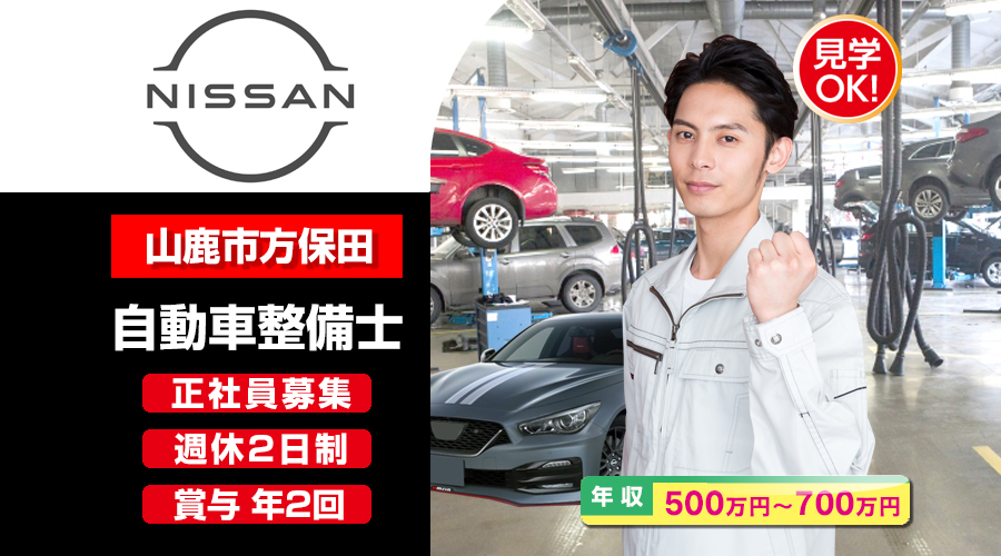 仕事内容 | 【主な業務】 ・自動車整備(点検・車検・修理)、整備入庫後の整備結果説明、整備後の調子伺い(アフターコール)などの業務を担当していただきます。 【具体的には】 ・1店舗あたりのメカニック人数は5名~12名程度。1人あたり1日4~7台程を担当します(時期による)。 ・一般ユーザーの車両を担当。日産の代表的なスポーツカーの整備に携わるキャリアも可能です。 ・整備と顧客への内容説明等の対応もお願いします。 ・同じ車両でも、点検、整備など、工程によって分業を進めています。
