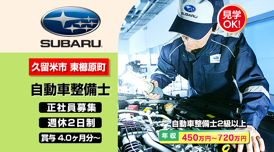 福岡スバル株式会社【福岡スバル】 自動車整備士・メカニック(福岡県久留米市東櫛原町)
