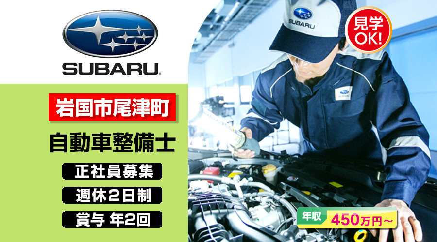 自動車整備士3級以上求人!年収450万円以上!山口県岩国市尾津町 山口スバル株式会社 転職採用情報!給料・環境・社会保険充実!